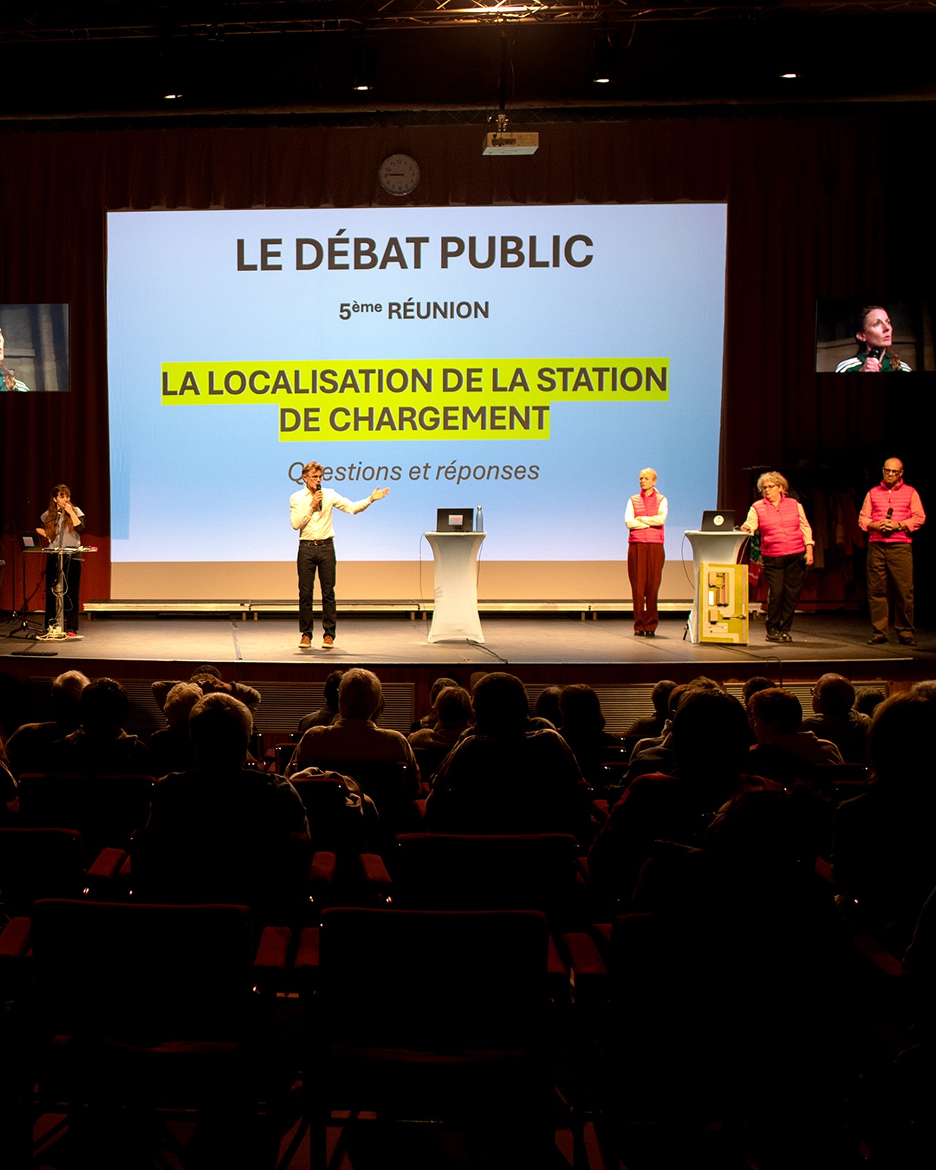 Le président du CNDP resitue la soirée au sein d’une série invraisemblable de 20 débats programmés dans la région, saucissonnant la question en sous-problématiques sans intérêt. L’entreprise de Ferrer consiste à démonter cette logique de fragmentation de la question écologique pour la ramener à une approche fondamentale : a-t-on besoin de tant de lithium ? Une Nicole du côté du (vrai/faux) public crie sa colère. Il faut extraire, dit-elle, une tonne de terre pour obtenir les neuf kilos de lithium nécessaires à un SUV d’une tonne, lequel servira à acheter une baguette de 250 g.